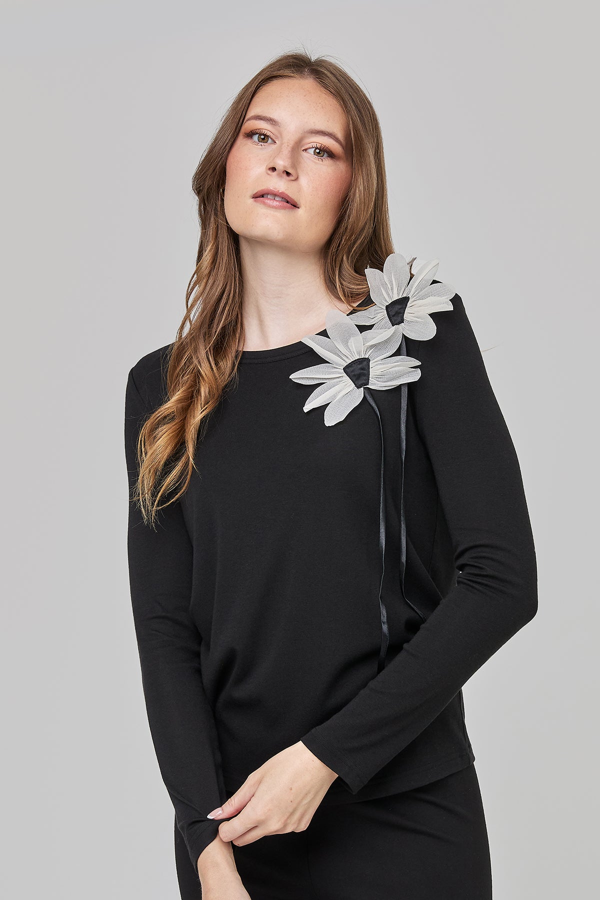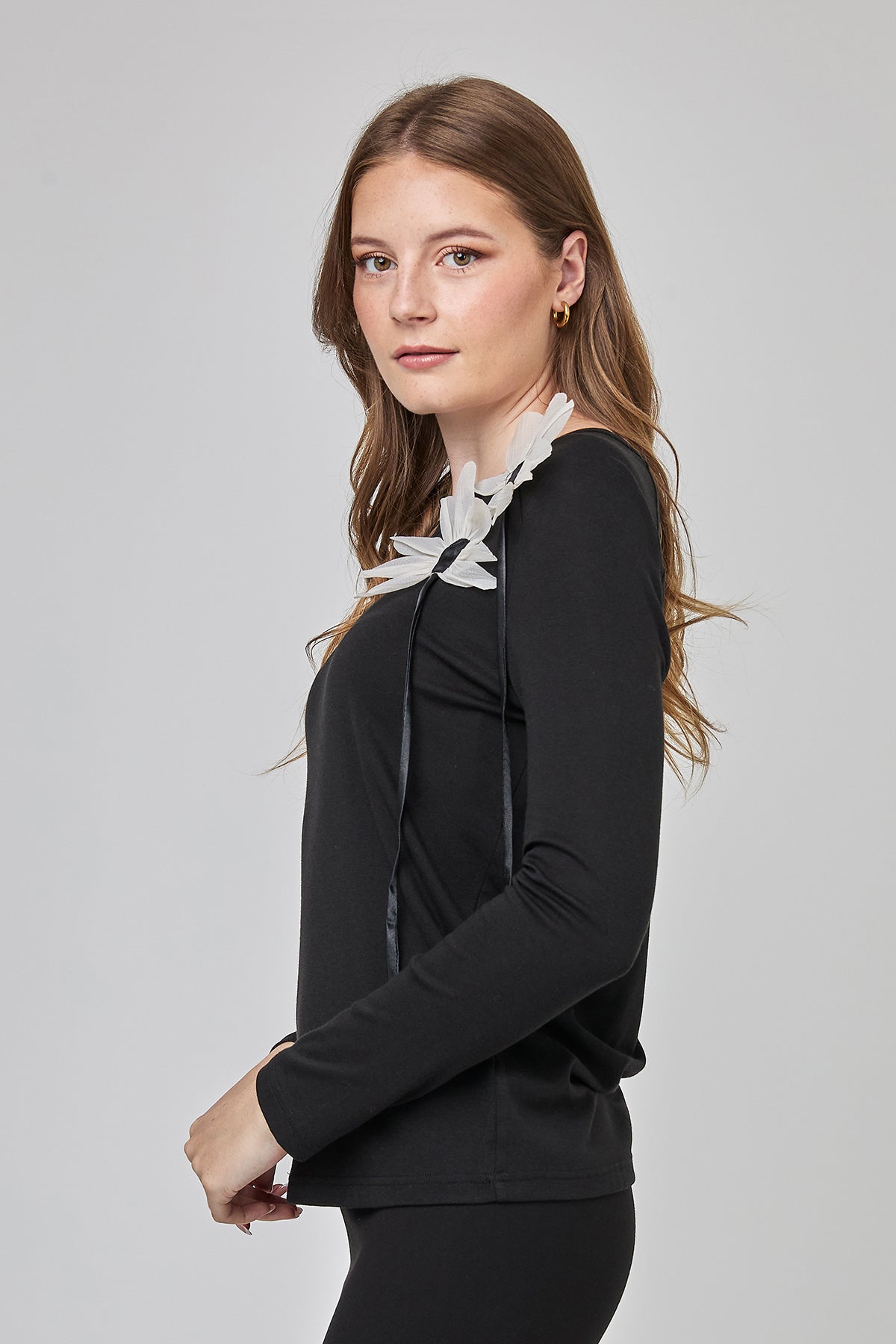 Floral Long Sleeve Top with Decorative Tie | CF25-316- Black